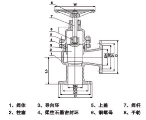 UJ44SM/H6/25C/P 角式柱塞閥圖 1.閥體;2.柱塞;3.導向環(huán);4.柔性石墨密封環(huán);5.上蓋;6.銅螺母;7.閥桿;8.手輪